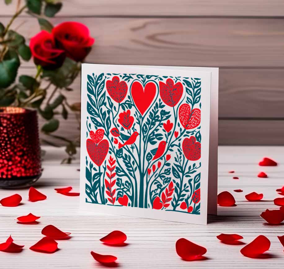 Botanical Embrace – Digital Print with a Linocut-inspired Design – Valentine’s Card