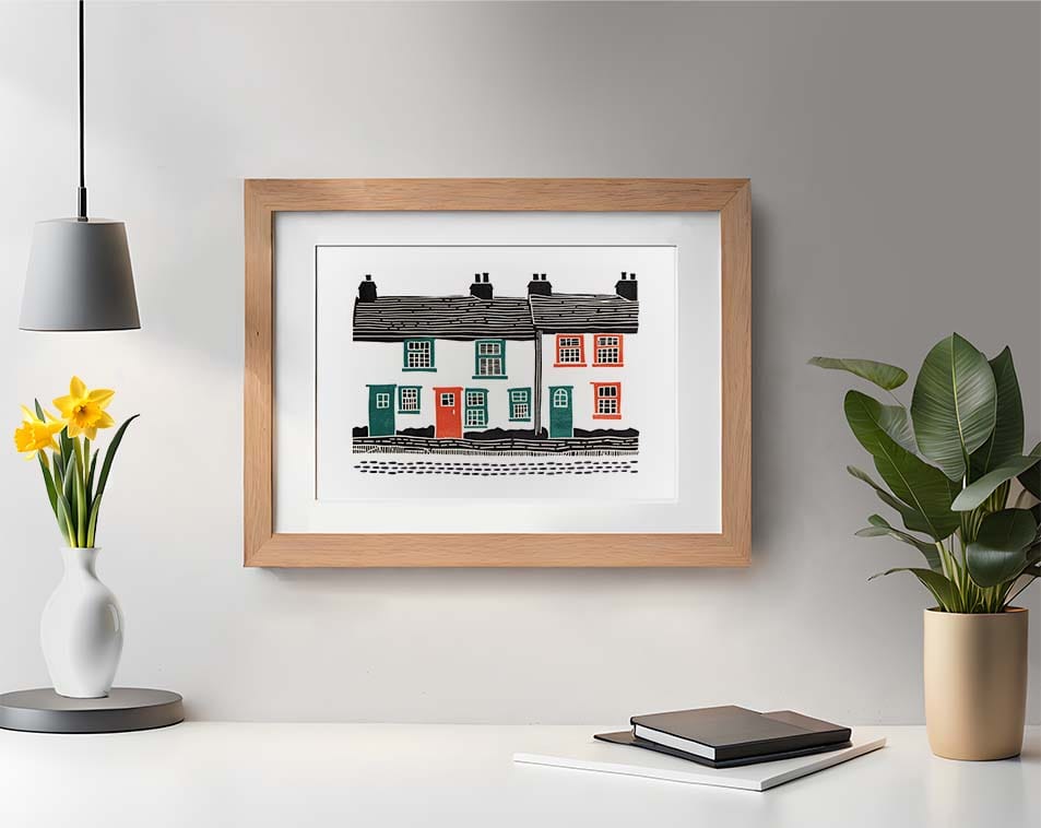 Step into the vibrant world of “Rainbow Terrace” with our captivating digital art print. This lively piece draws inspiration from traditional linocut techniques, featuring a row of colourful terrace houses against a clean white backdrop.